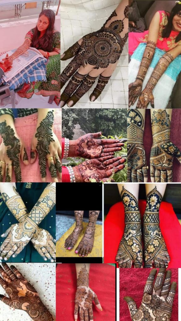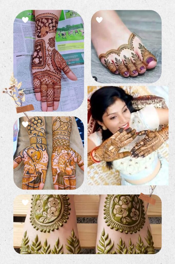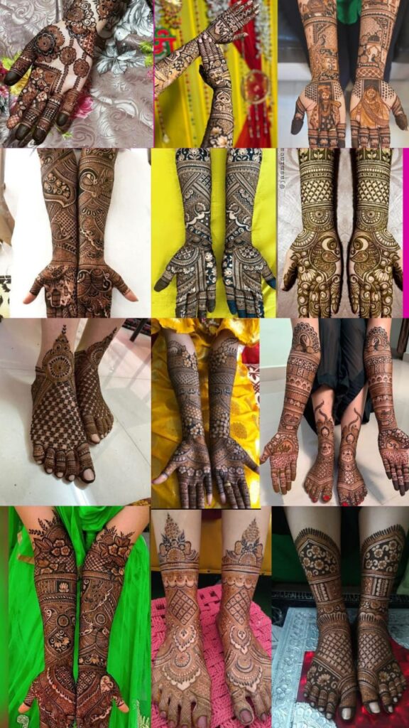Rich in detail, Indian designs include intricate patterns like peacocks, paisleys, floral motifs, and bride-groom figures, often covering the entire hands and feet.